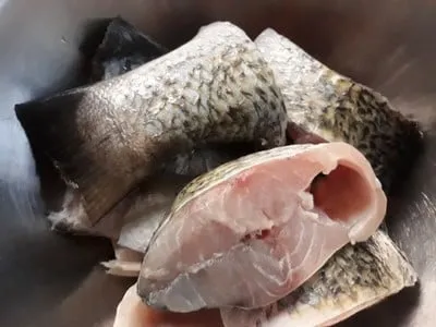- ปลากะพง ขอดเกล็ดปลาออก ล้างทำความสะอาด หั่นเป็นชิ้น เตรียมไว้
